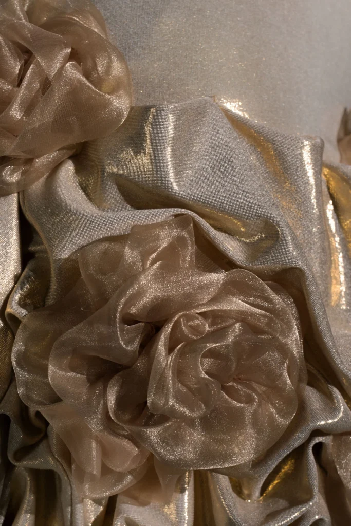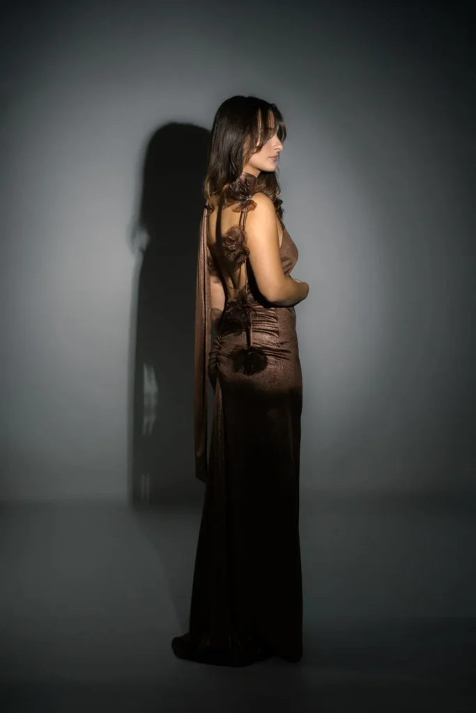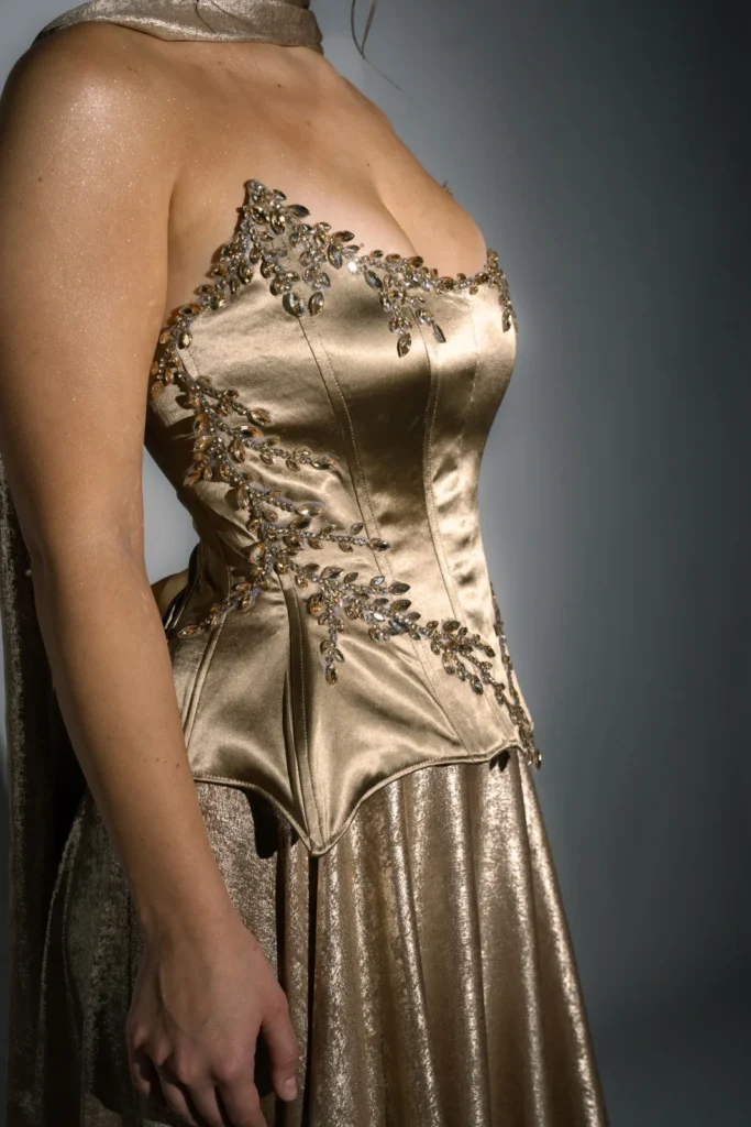 Die langen Kleider mit Korsett vereinen klare Struktur mit fließender Silhouette. Ihre Formgebung ist inspiriert von klassischer Couture, in der das Korsett nicht nur Halt gibt, sondern die natürliche Eleganz des Körpers betont.