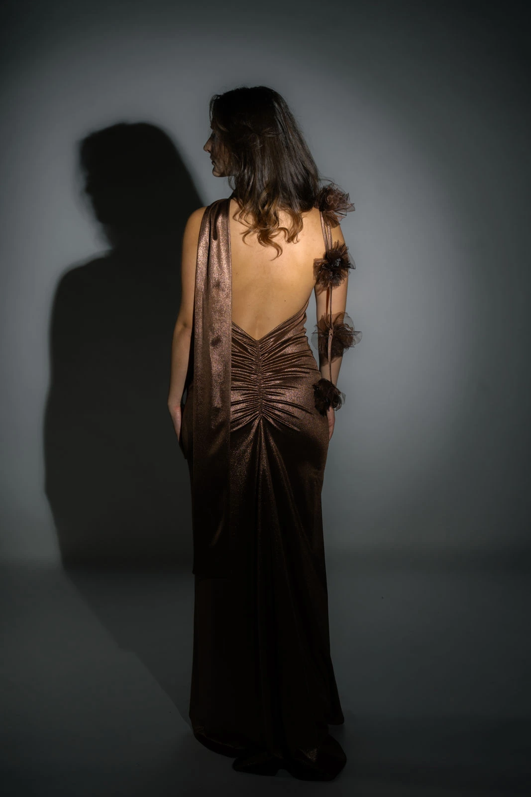 Die frontseitige Drapierung zieht den Blick sanft über die Silhouette, während der tiefe, freie Rücken das eigentliche Versprechen dieses Designs offenbart: Haut, Spannung, Kontrolle. Die zarten floralen Applikationen entlang der Schulter wirken wie ein bewusst gesetztes Spiel aus Unschuld und Provokation – ein Detail, das näher betrachtet werden will. Der fließende, integrierte Schal verlängert jede Bewegung und hinterlässt Wirkung, noch bevor man sich umdreht.