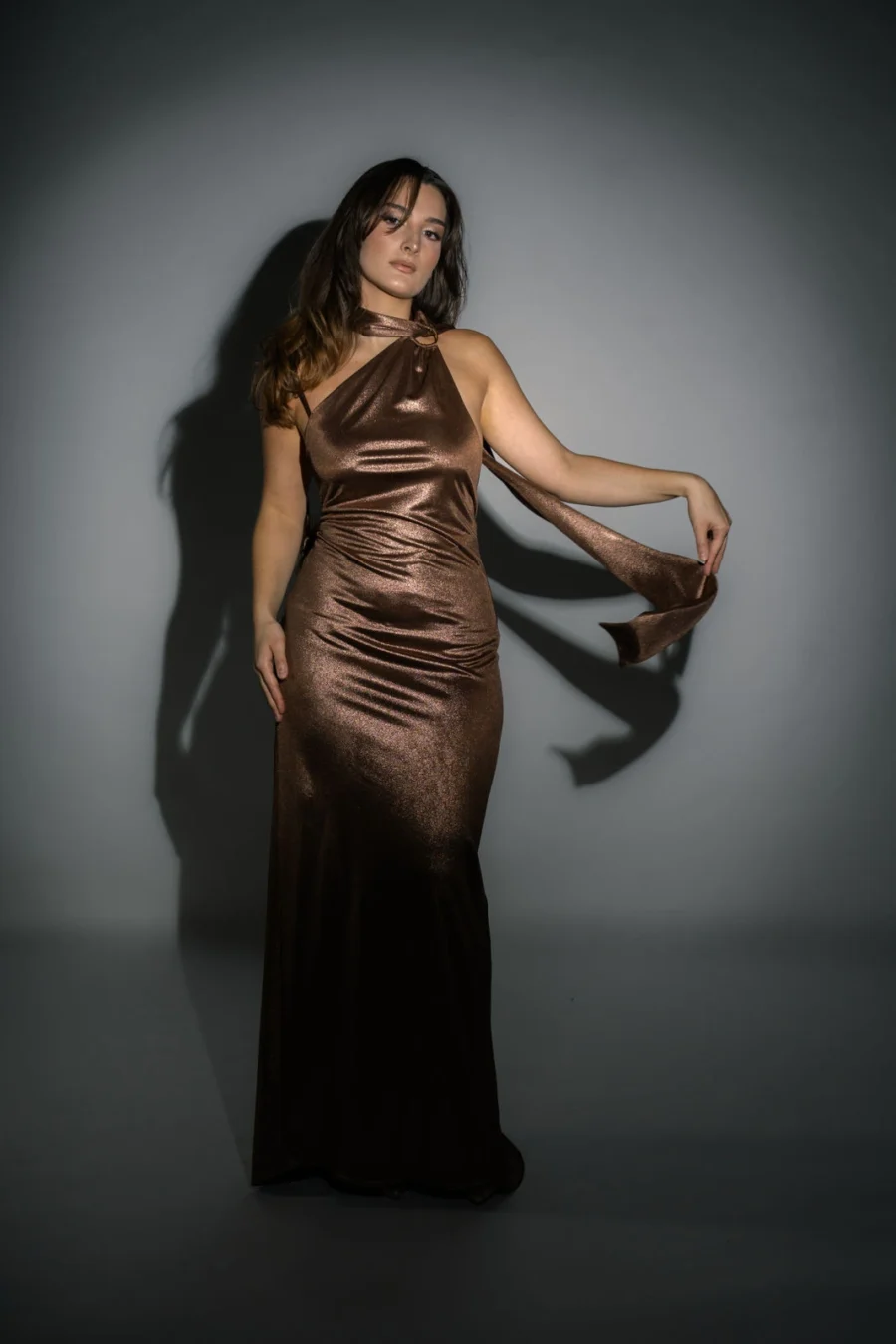 Dieses Abendkleid ist pure Verführung in Bewegung. Der flüssig schimmernde Stoff liegt wie geschmolzenes Metall auf der Haut und modelliert den Körper mit jeder Linie, jeder Kurve, jedem Schritt. Es ist kein Kleid, das begleitet – es führt.