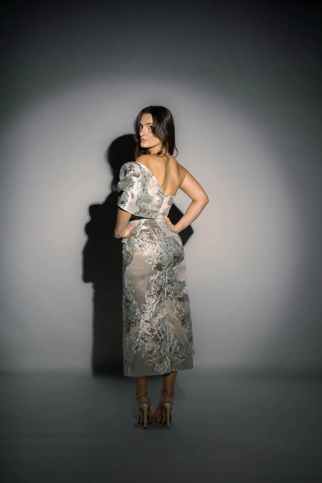 Die skulpturale Off-Shoulder-Schleife rahmt Schultern und Dekolleté auf sinnliche, fast nonchalante Weise. Sie wirkt wie ein bewusst gesetzter Akzent zwischen Zurückhaltung und Begehren. Darunter folgt der körpernahe Gown der Silhouette bis in die Länge – klar, ruhig, kompromisslos feminin. Jeder Schritt lässt den Jacquard sanft aufleben und verstärkt das Gefühl von Bewegung auf der Haut.